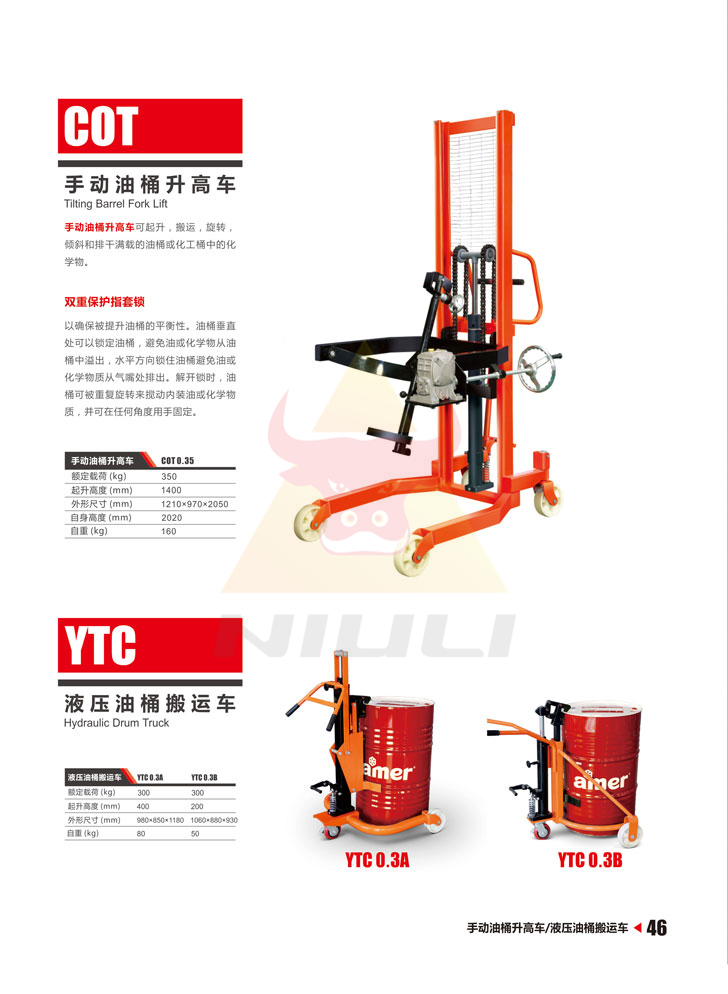 YTC0.3B油桶搬運車可搬運、起升油桶。具有鎖定油桶、升降平穩、結構緊湊、操作簡便等特點。